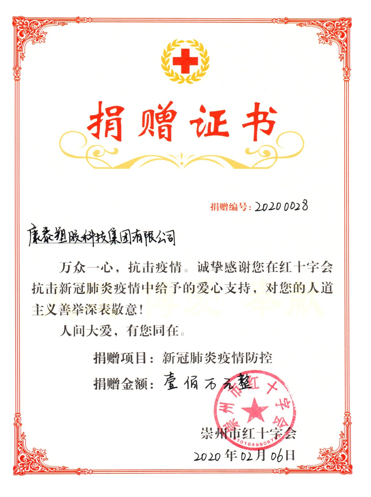 2021.07洪水無情 康泰有愛-康泰集團鄭州子公司及員工、經銷商捐款52萬余元支援河南抗洪救災近期,受極端暴雨影響,河南多地出現(xiàn)嚴重的洪水災情,牽動全國人民的心。為支持河南省防汛救災工作,7月25日,康泰塑膠科技集團(鄭州)有限公司通過新鄭市紅十字會,向河南災區(qū)捐款50萬元,用于防汛救災和災后重建工作。圖為捐贈證書同時,在...閱讀人數(shù):9892 -