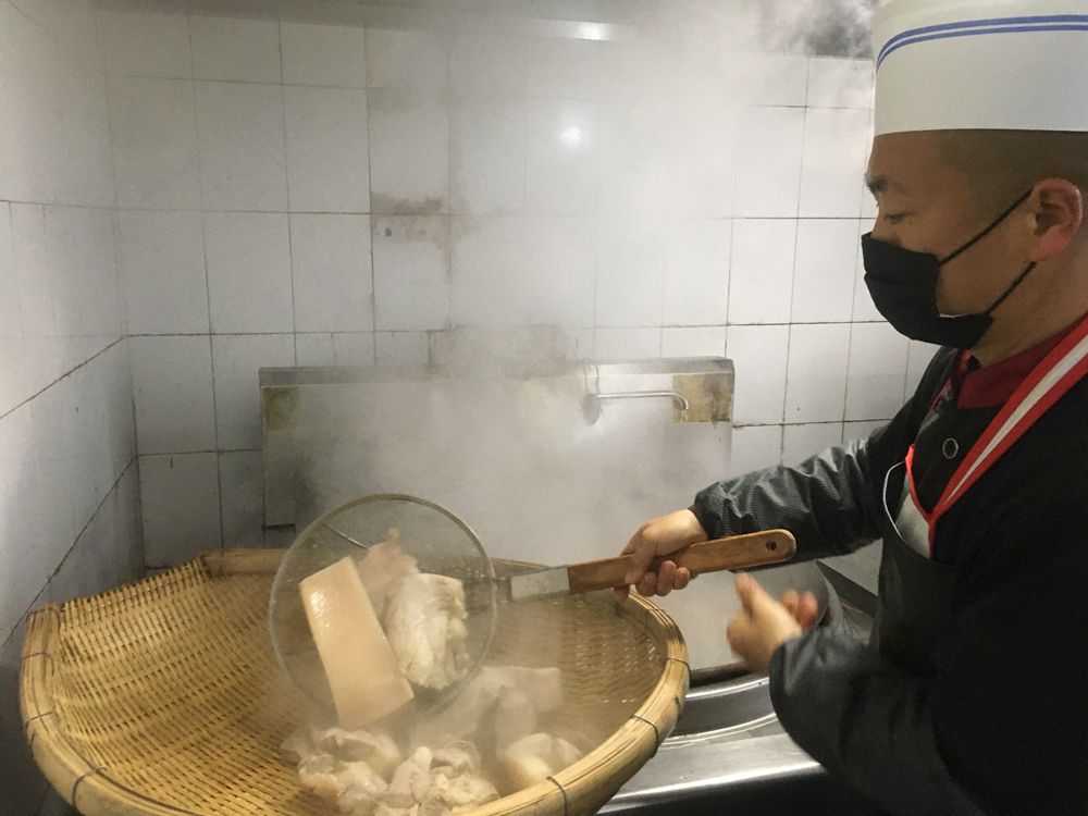 圖為食堂工作人員佩戴口罩作業(yè)