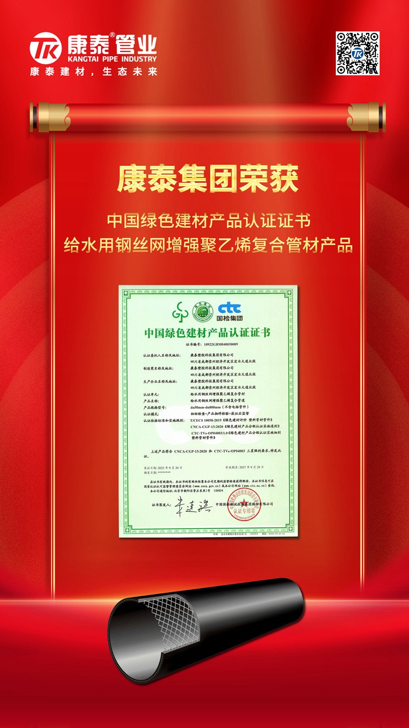 近日,康泰塑膠的給水用聚乙烯(PE)管材、管件產(chǎn)品,燃?xì)庥寐竦鼐垡蚁?PE)管材、管件產(chǎn)品,冷熱水用聚丙烯(PPR)管材、管件產(chǎn)品,埋地用聚乙烯(PE)雙壁波紋管材產(chǎn)品,冷熱水用耐熱聚乙烯(PE-RT)管材產(chǎn)品,給水用鋼絲網(wǎng)增強(qiáng)聚乙烯復(fù)合管材產(chǎn)品順利中國(guó)國(guó)檢測(cè)試控股集團(tuán)股份有限公司認(rèn)證審核,獲得中國(guó)綠色產(chǎn)品認(rèn)證證書。充分展現(xiàn)了康泰塑膠獲證產(chǎn)品在多種綠色屬性和考核指標(biāo)的硬核實(shí)力。