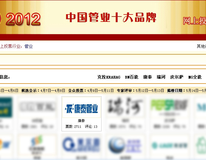 圖為康泰塑膠科技集團(tuán)獲2012年中國(guó)管業(yè)十大品牌評(píng)選網(wǎng)頁