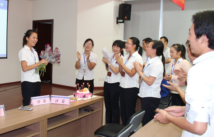 演講比賽結(jié)束后,9月員工生日會(huì)隆重舉行。很多9月生日的員工因?yàn)楣ぷ髟蛭茨苓_(dá)到現(xiàn)場(chǎng),隨著“祝你生日快樂”熟悉的旋律響起,一段9月生日員工的PPT向大家展示了9月壽星們?cè)诠ぷ鲘徫簧系木耧L(fēng)貌,而來自采供中心的何瑤代表他們接受了大家的鮮花與祝福。