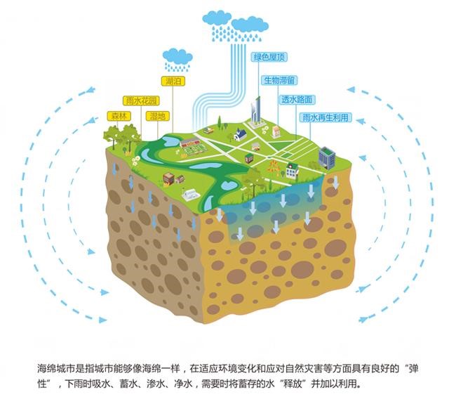 ?????? 海綿城市是指通過建設(shè)綠色屋頂、可滲透路面、下凹式綠地、城區(qū)河湖水域和污水處理設(shè)施等,加強(qiáng)城市對(duì)自然災(zāi)害的承載力,下雨時(shí)吸水、蓄水、滲水、凈水,需要時(shí)將蓄存的水“釋放”并加以利用。當(dāng)然,實(shí)現(xiàn)“海綿城市”的前提是,城市里擁有強(qiáng)大的雨水快速收集、排放管網(wǎng)系統(tǒng)。