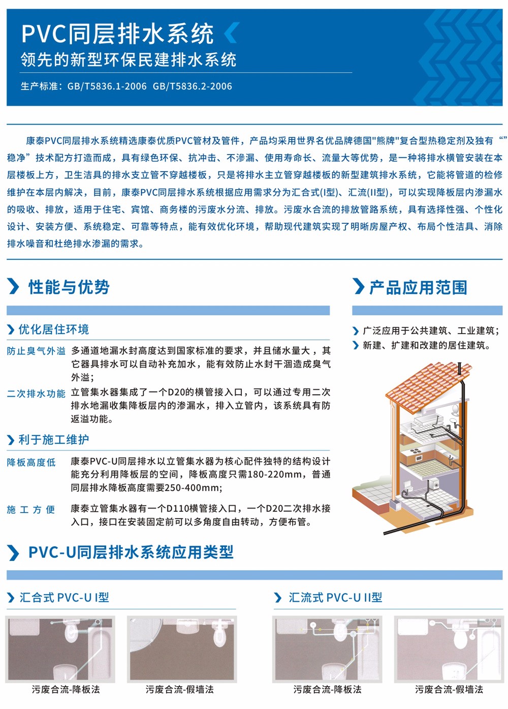 康泰PVC同層排水系統(tǒng)精選康泰優(yōu)質(zhì)PVC管材及管件,產(chǎn)品均采用世界名優(yōu)品牌德國“熊牌”復(fù)合型熱穩(wěn)定劑及獨有“穩(wěn)凈”技術(shù)配方打造而成 ,具有綠色環(huán)保、抗沖擊、不滲漏、使用壽命長、流量大等優(yōu)勢,是一種將排水橫管安裝在本層樓板上方,衛(wèi)生潔具的排水支立管不穿越樓板,只是將排水主立管穿越樓板的新型建筑排水系統(tǒng),它能將管道的檢修維護在本層內(nèi)解決。目前,康泰PVC同層排水系統(tǒng)根據(jù)應(yīng)用需求分為匯合式(I型)、匯流式(Ⅱ型),可以實現(xiàn)降板層內(nèi)滲漏水的吸收、排放,適用于住宅、賓館、商務(wù)樓的污廢水分流、排放,污廢水合流的排放管路系統(tǒng),具有選擇性強、個性化設(shè)計、安裝方便、系統(tǒng)穩(wěn)定、可靠等特點,能有效優(yōu)化環(huán)境,幫助現(xiàn)代建筑實現(xiàn)了明晰房屋產(chǎn)權(quán)、布局個性潔具、消除排水噪音和杜絕排水滲漏的需求。
